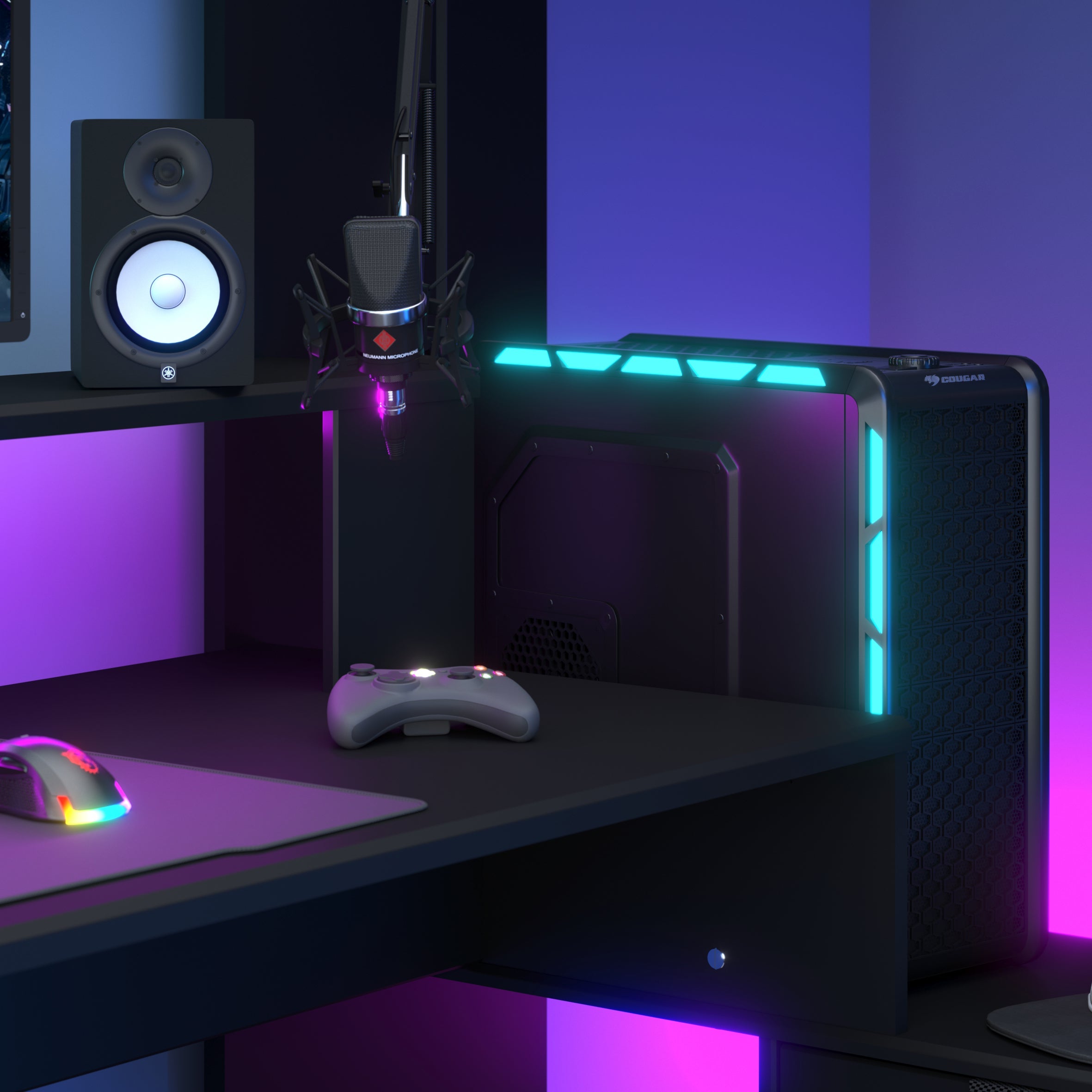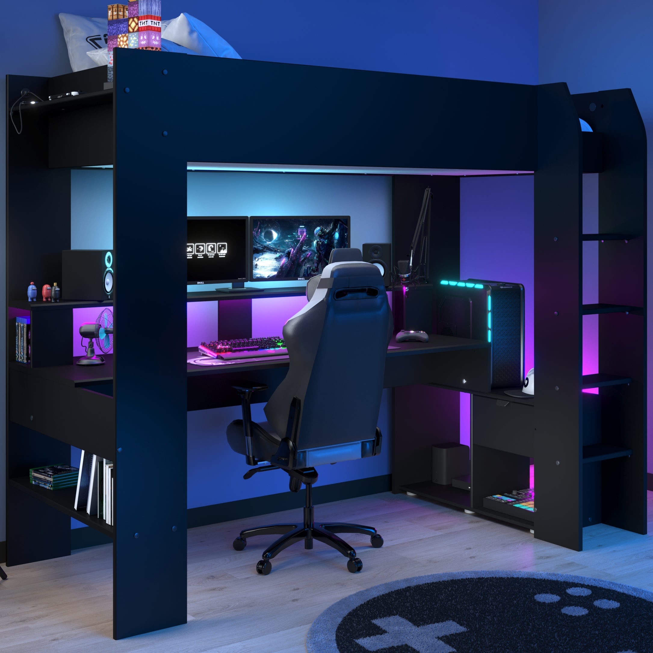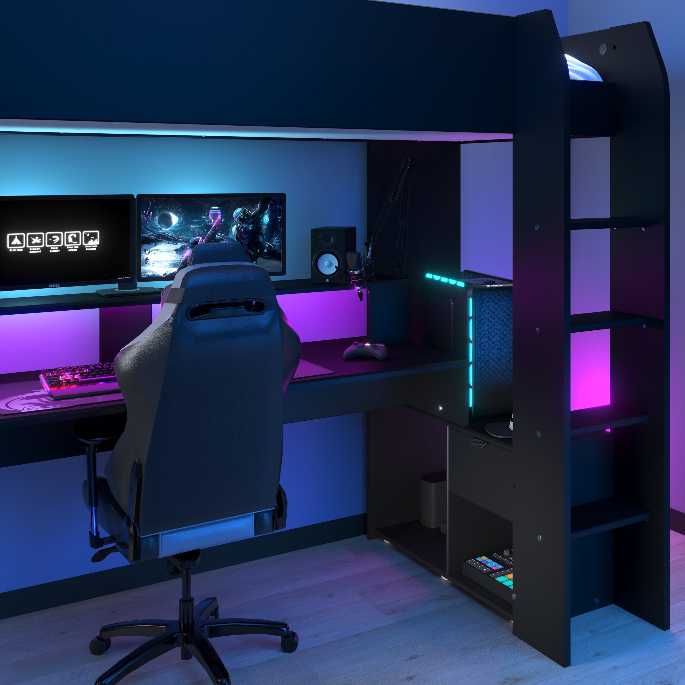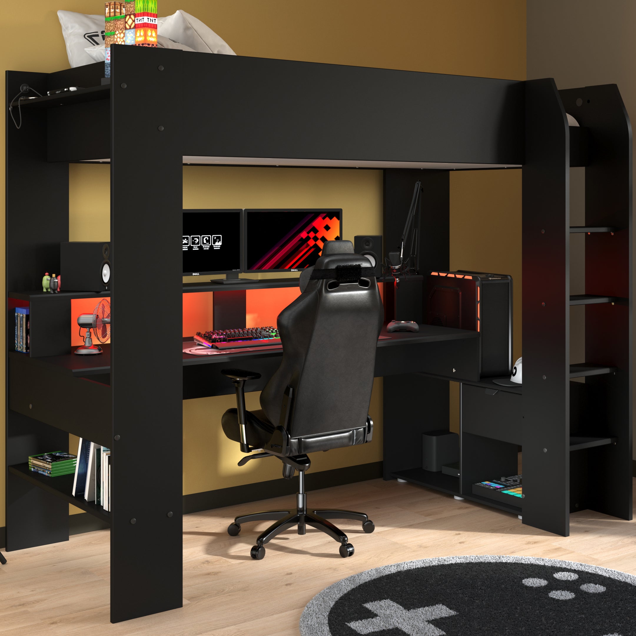 Gaming Highsleeper Black Bed with Built-In LED Lights & Gaming Desk - Online from Parisot