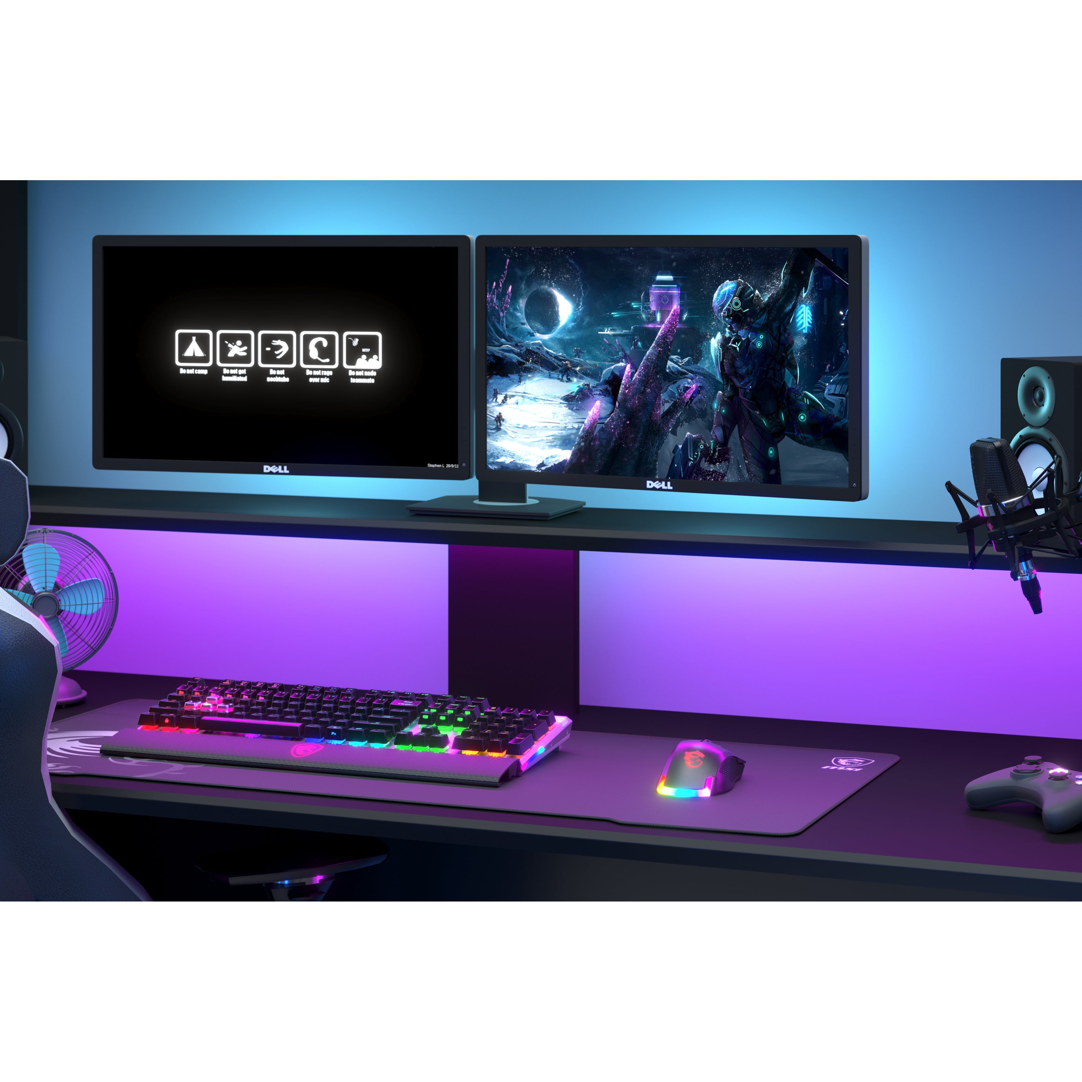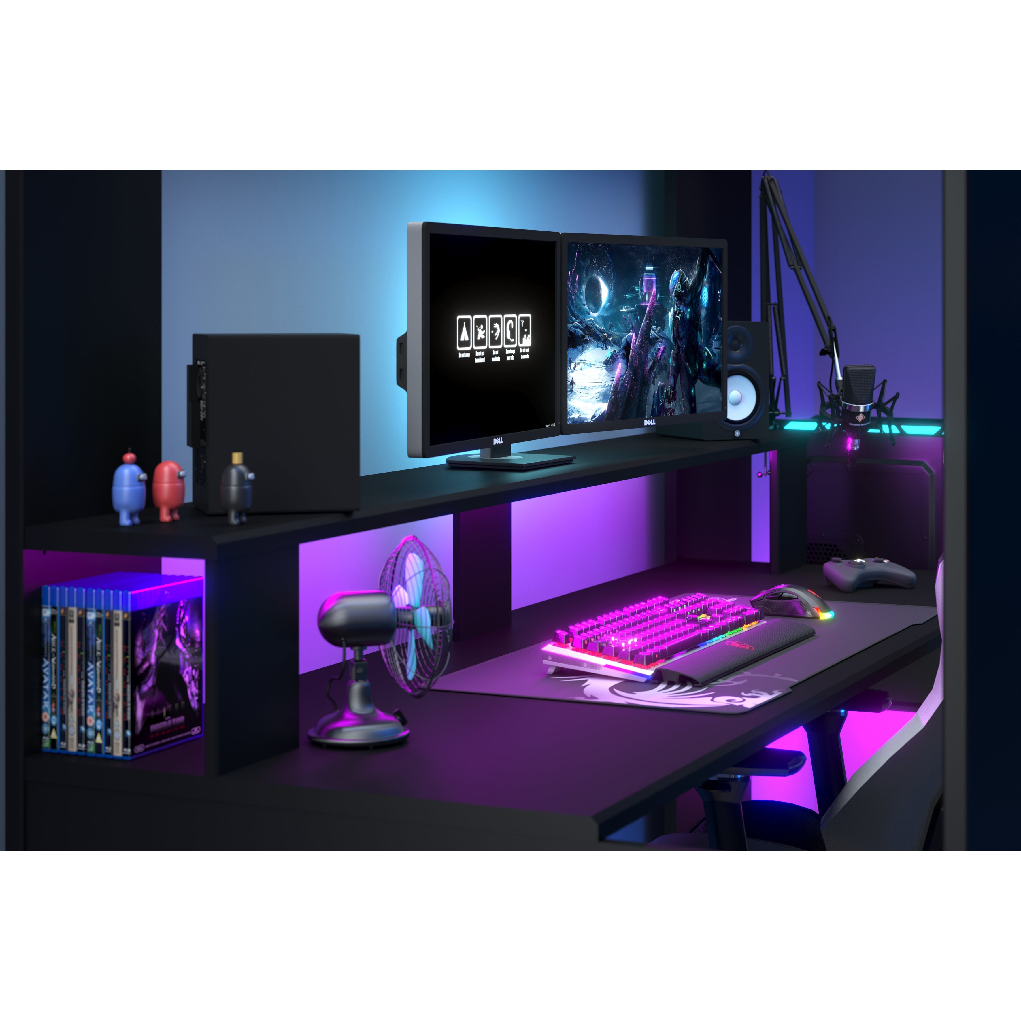 This new gaming loft bed features a generously-sized desktop measuring 1.84 meters wide, complete with an elevated monitor shelf. Additionally, there's a convenient bedside platform equipped with a double USB socket for charging devices, along with a fantastic LED lightstrip that offers a choice of light colours to match your mood or decor, all controlled via a remote control.