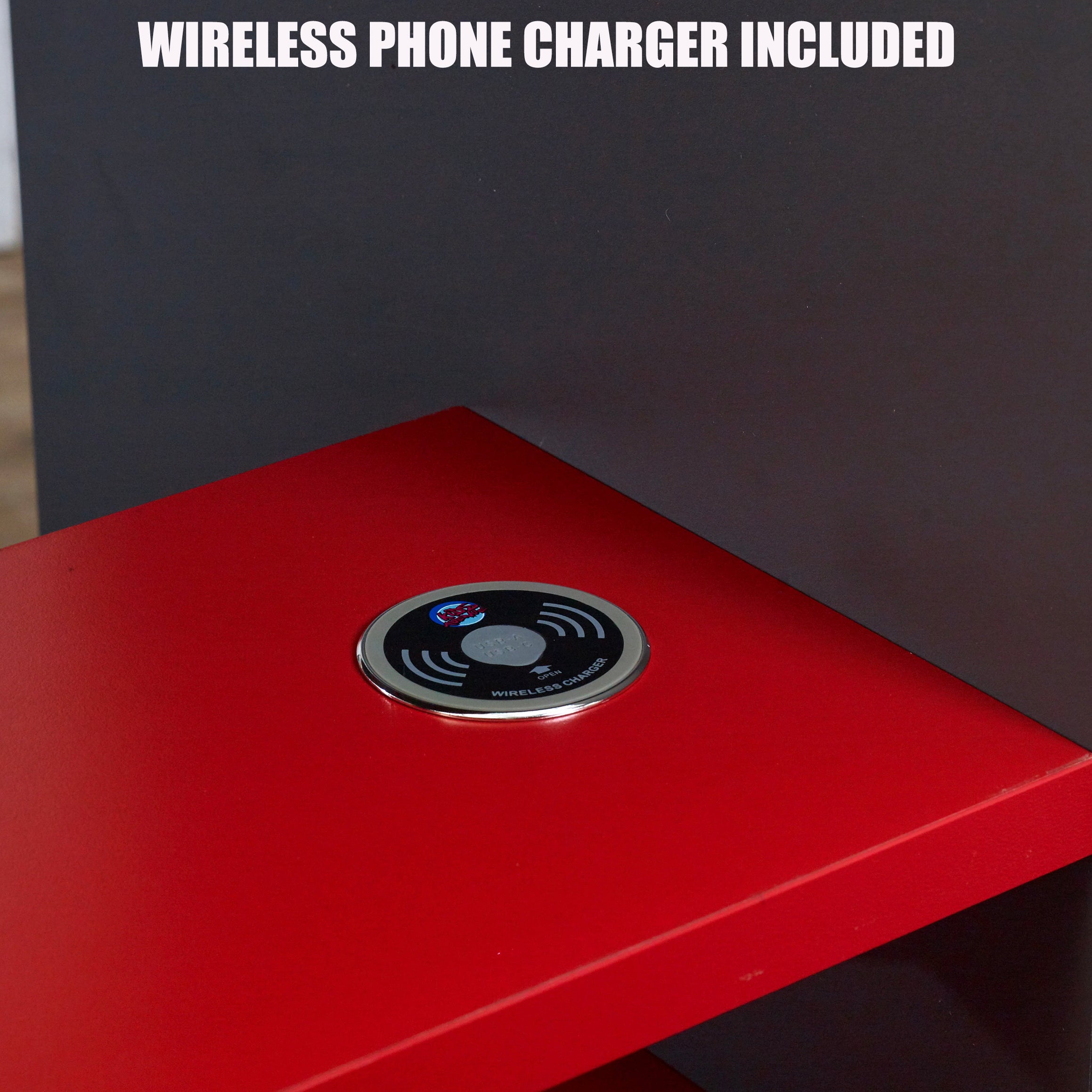Additionally, a wireless phone charger unit is included, ready to be set up for hassle-free charging of compatible phones, complete with a USB port for added convenience.