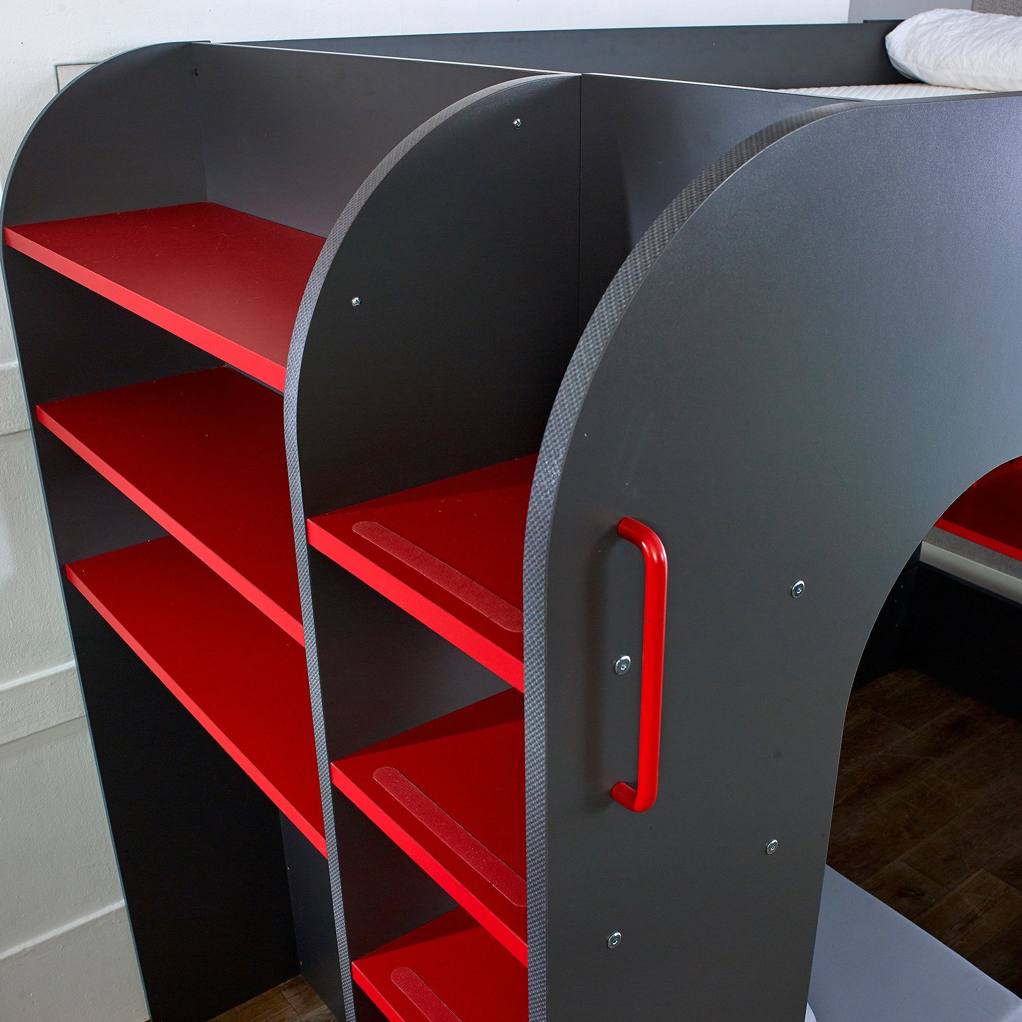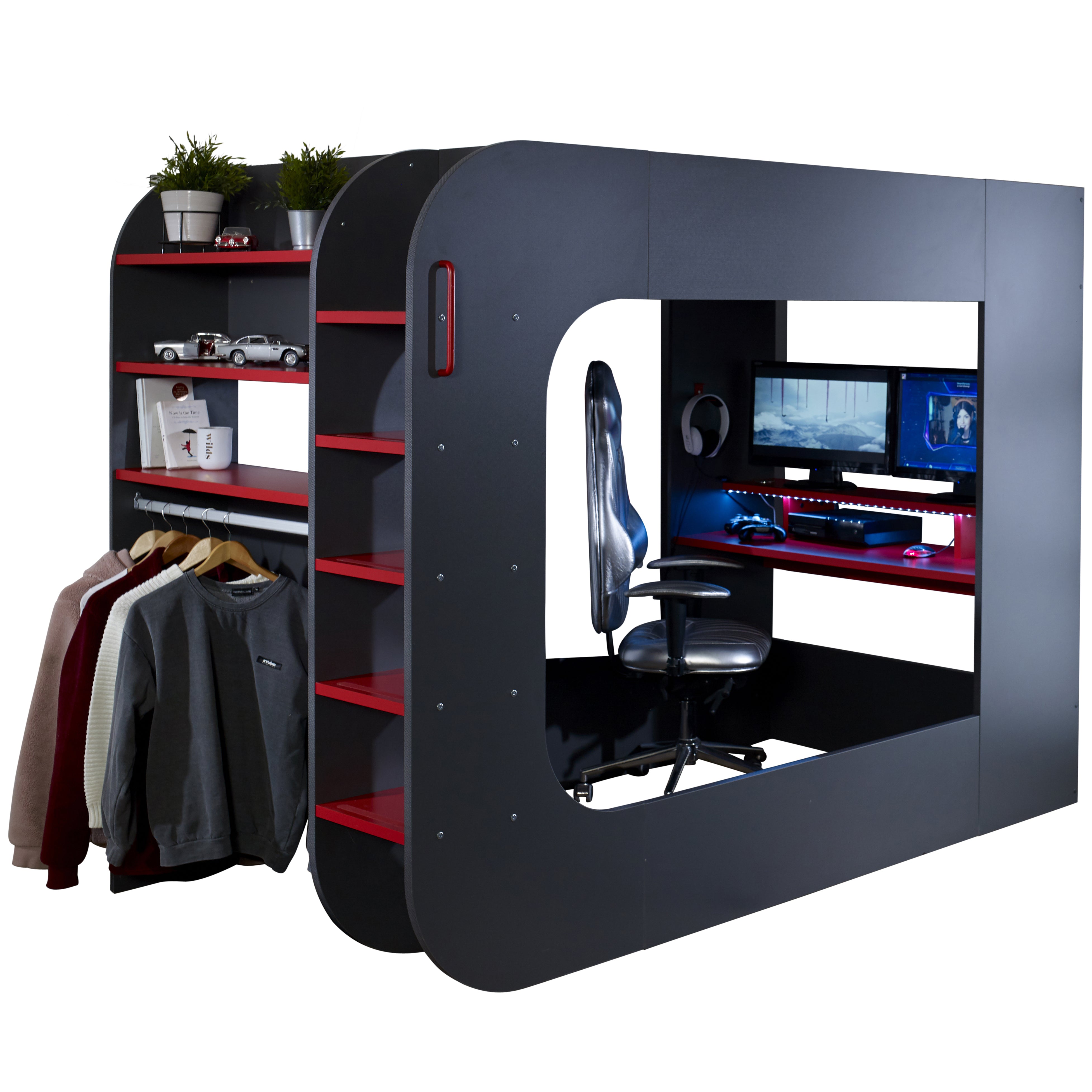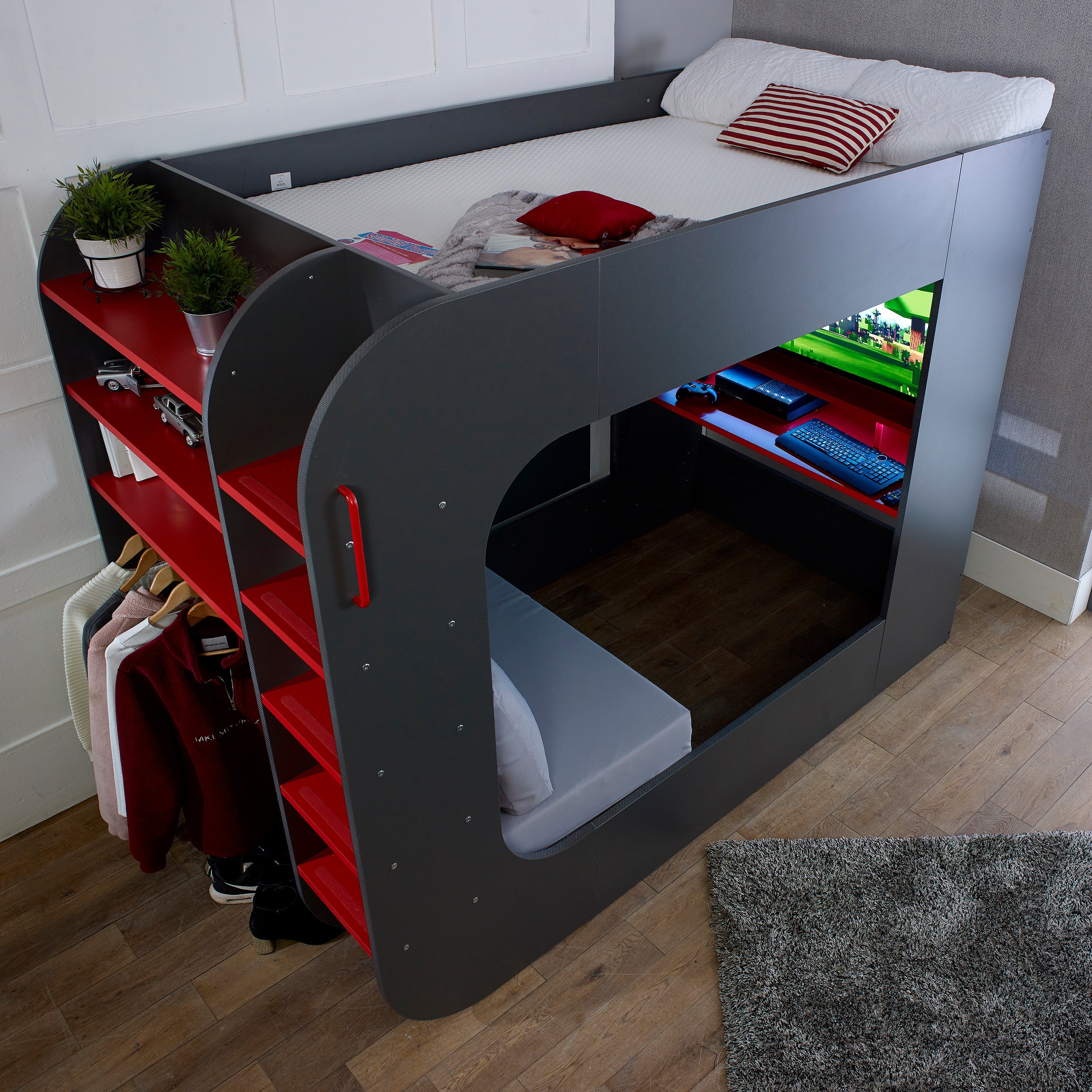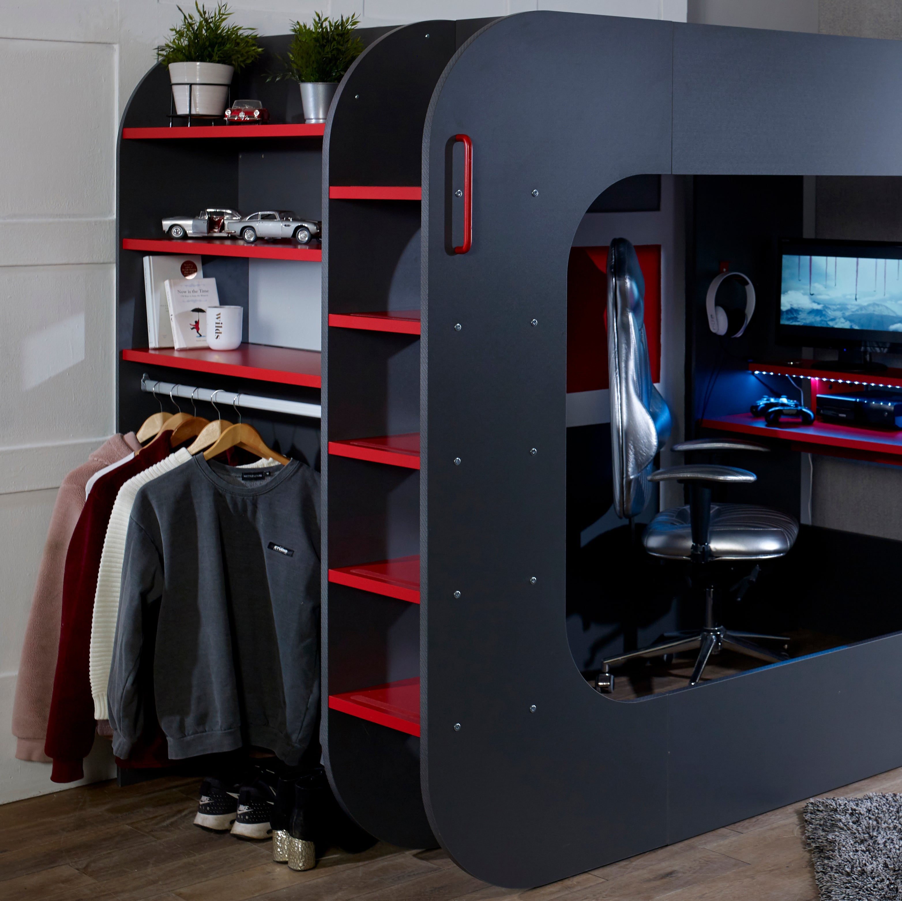 Introducing the premium gaming high bed from a leading European manufacturer! This fantastic new loft bed from the Trasman collection has been expertly crafted with gamers in mind. Beware of lesser-quality imitations found on the high street - this is the original British-designed "Podbed" gaming bed, not a subpar import. Available in a small double size, with a single bed version also on offer, this bedframe comes in a sleek grey finish with striking red desk and end panels, adding a modern touch to any bedroom decor. Its unique "pod" design allows access from either side, making it the ultimate setup for gamers, providing a space for sleeping, relaxing, studying, and, of course, gaming. Built to last and sturdy in construction, it's suitable for older kids and adults alike.