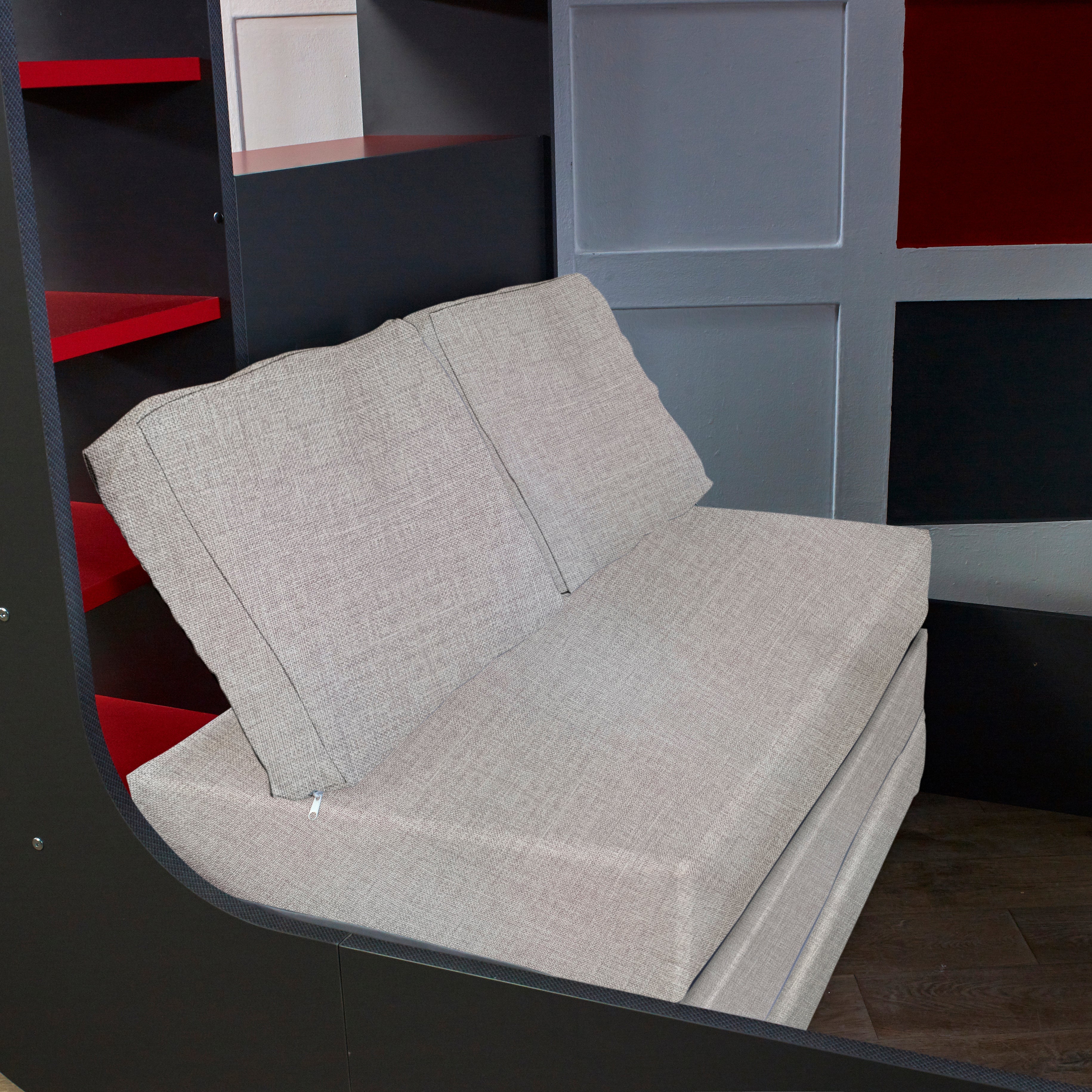 For added versatility, consider the optional extra of a custom-made pull-out sofabed, neatly fitting under the high bed to serve as a comfortable sofa and extending into a full-length guest bed when needed, measuring 120x200cm, the size of a small double mattress.