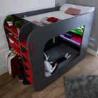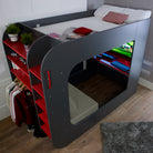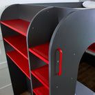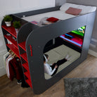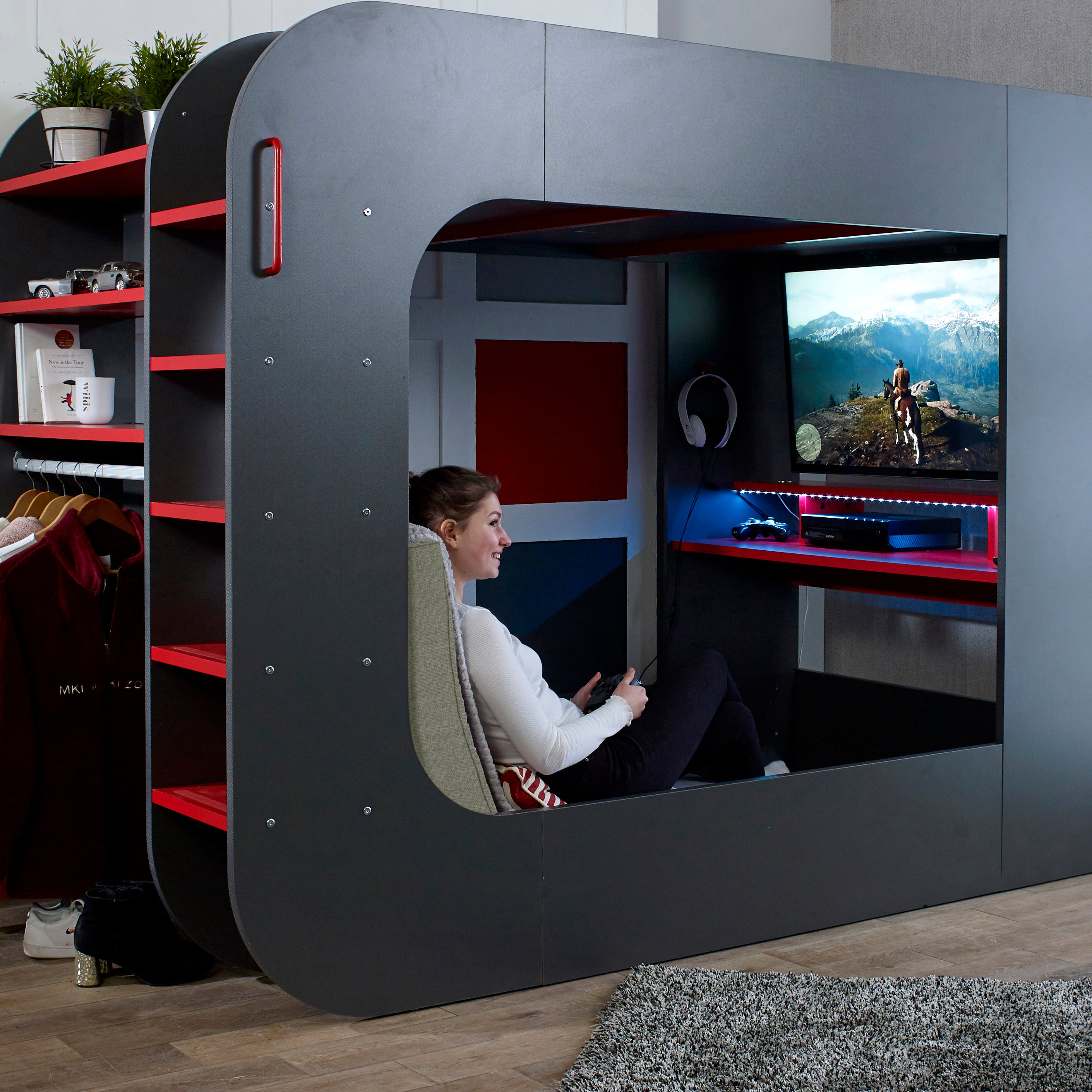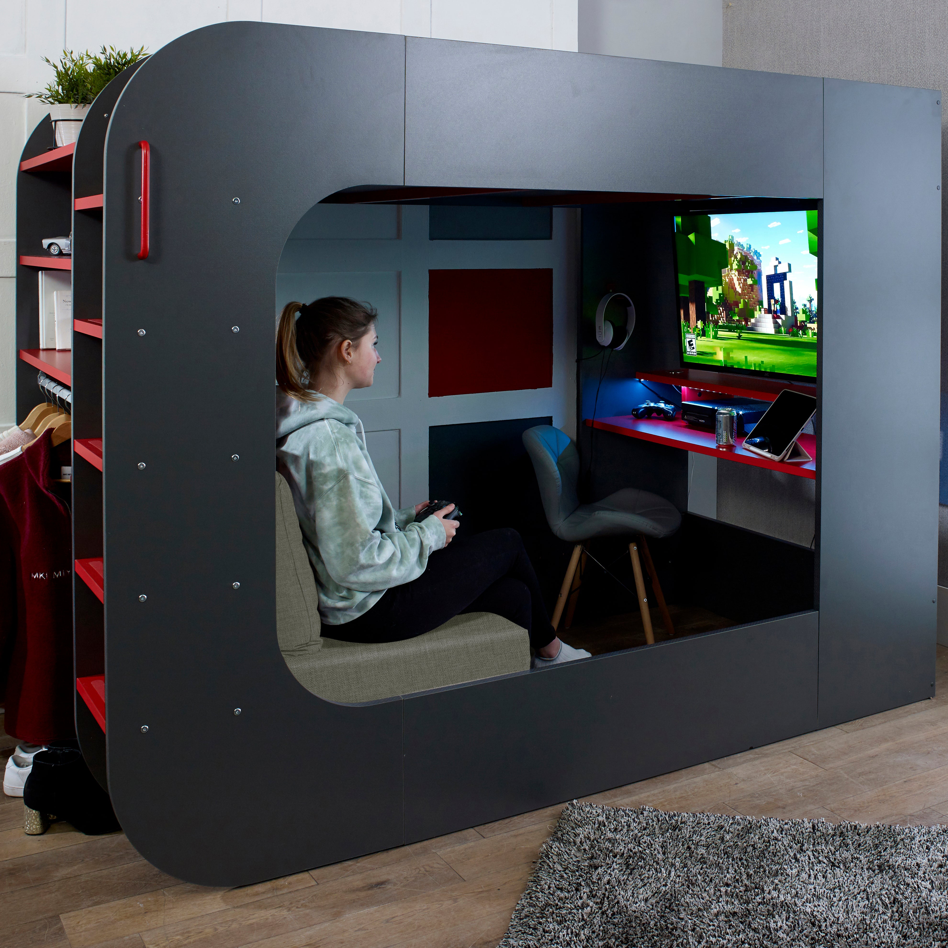 Available in a small double size, with a single bed version also on offer, this bedframe comes in a sleek grey finish with striking red desk and end panels, making it a contemporary addition to any bedroom. Its unique "pod" design allows access from either side, providing the perfect setup for gamers to sleep, relax, study, and, of course, play. Sturdily constructed and durable, it's suitable for older kids and adults too.